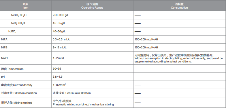 Ni7B :低电促进剂,也是柔软剂,消除镀层内应力,促进镀层均匀分布。Ni7B不足时,镀层脆性大,低电流密度区光亮度差;Ni7B过量时,可能造成后续镀铬困难等问题;