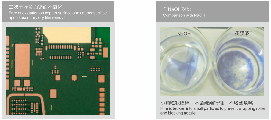 用于PCB制作中内层干膜、外层干膜和化镍金选化干膜的褪除,特别适用于精细线路干膜的去除,可用于IC载板和MSAP制程去膜。